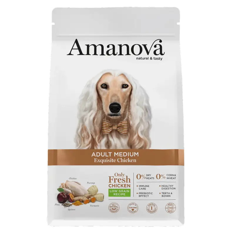 A ração Amanova Adult Medium Exquisite Chicken com Quinoa é uma opção premium e hipoalergénica, especialmente formulada para cães adultos de raças médias. Elaborada com 71% de frango fresco como única fonte animal, esta receita assegura uma digestão otimizada e um perfil nutricional equilibrado, sem farinhas ou carnes desidratadas.