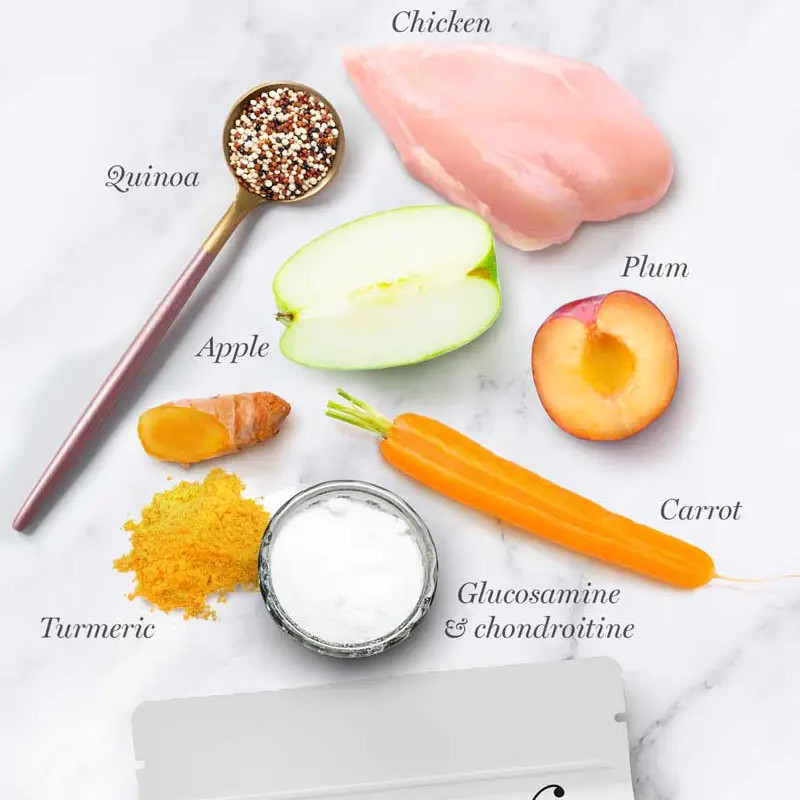 - Desenvolvimento muscular e articular: A combinação de frango fresco, glucosamina (1.400 mg/kg) e condroitina (1.000 mg/kg) fortalece músculos e articulações.