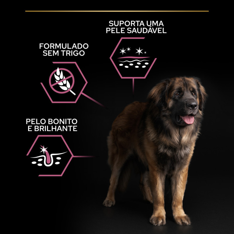 Pro Plan Adult Large Robust Sensitive Skin Rico em Salmão ajuda a manter a pele saudável e o pelo bonito, ao mesmo tempo que suporta um estilo de vida ativo.
