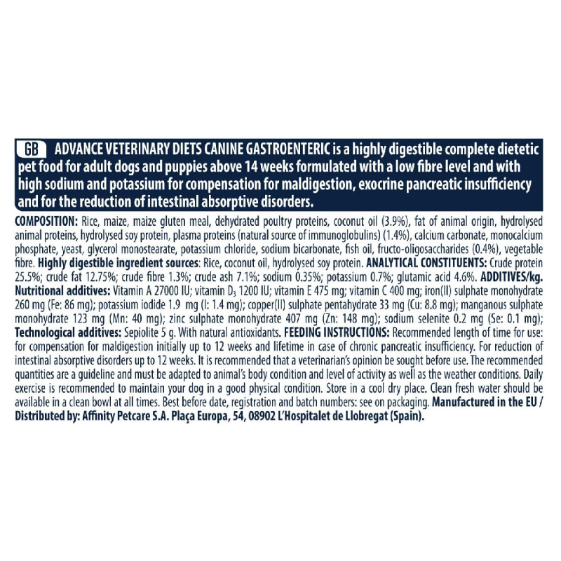 Dica: Potencie os efeitos da dieta combinando com Advance Veterinary Dog Wet Gastroenteric Medium-Maxi 400 gr a versão húmida ideal para um plano de nutrição completo.