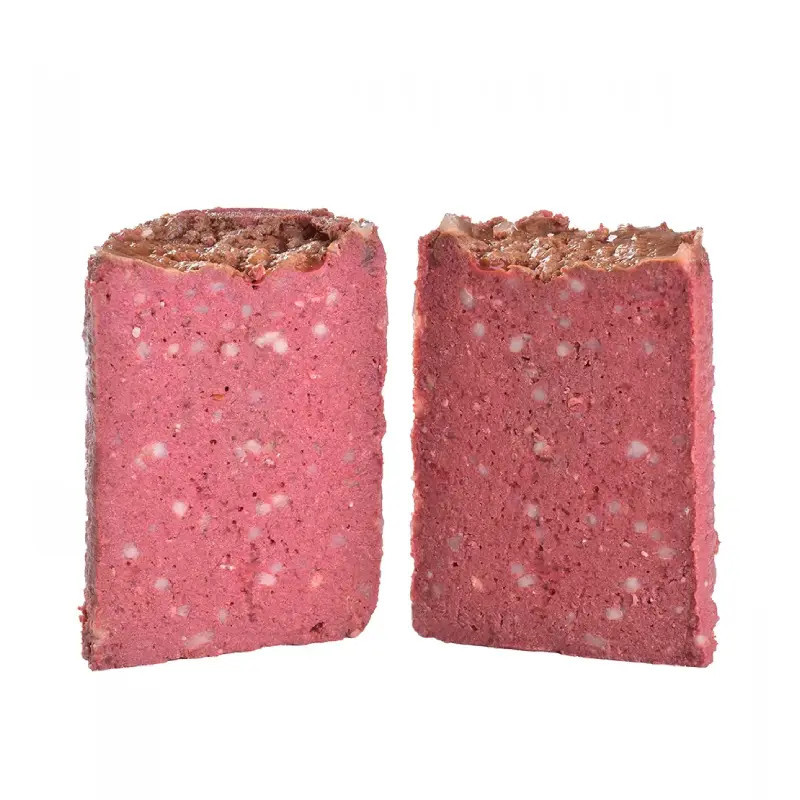 74% de vaca (carne, pulmões, fígado e corações de vaca), 21% de caldo de vaca, 4% de arroz, 1% de minerais.