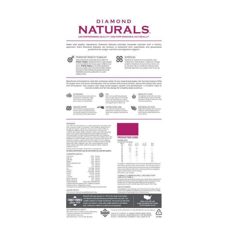 Diamond Naturals proporciona uma nutrição completa com uma abordagem holística. A gama Diamond Naturals Ração Cachorro Raças Grandes de Borrego é indicada para cachorros de raças grandes e possui generosas doses de glucosamina e condroitina para fortalecer e proteger as articulações. A fórmula Diamond Naturals Ração Cachorro Raças Grandes de Borrego é formulada para atender aos níveis nutricionais estabelecidos pelos Perfis Nutricionais de Alimentos para cachorros de grande porte da AAFCO em crescimento.