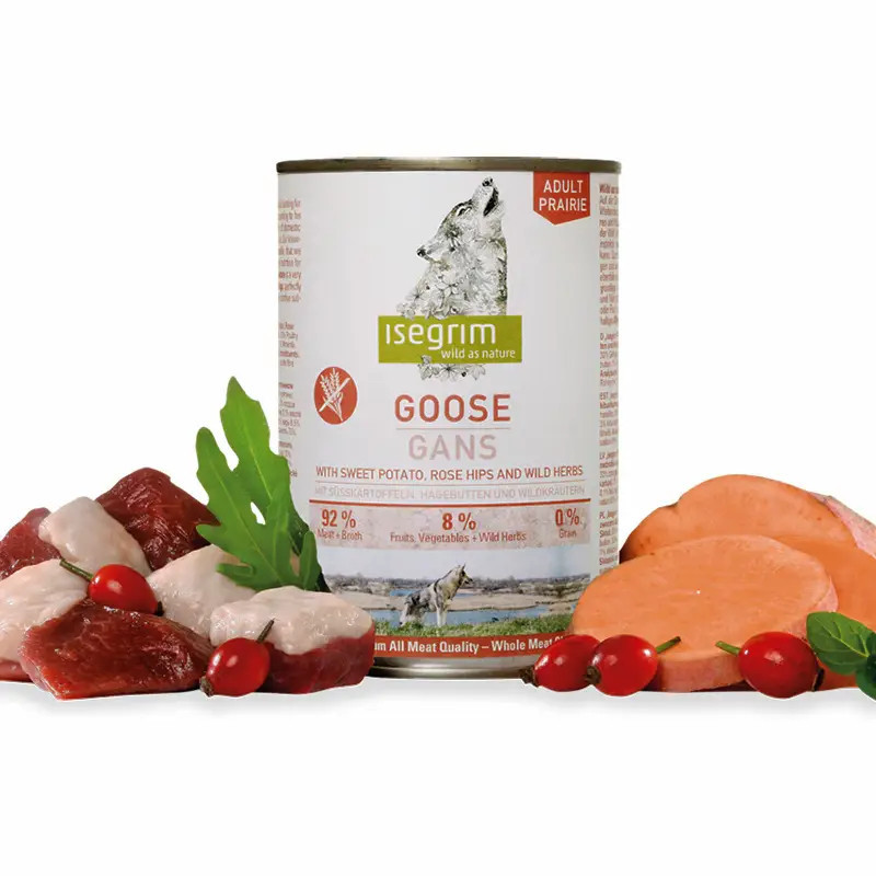 Isegrim Wet Ganso é uma receita completa e equilibrada, formulada com ingredientes naturais de alta qualidade para respeitar a herança ancestral do seu cão. Com carne suculenta de ganso, uma fonte nobre de proteína, este alimento húmido é enriquecido com batata-doce, rica em fibras e energia de longa duração, além de roseira brava e ervas silvestres, que fornecem antioxidantes e apoiam a digestão.