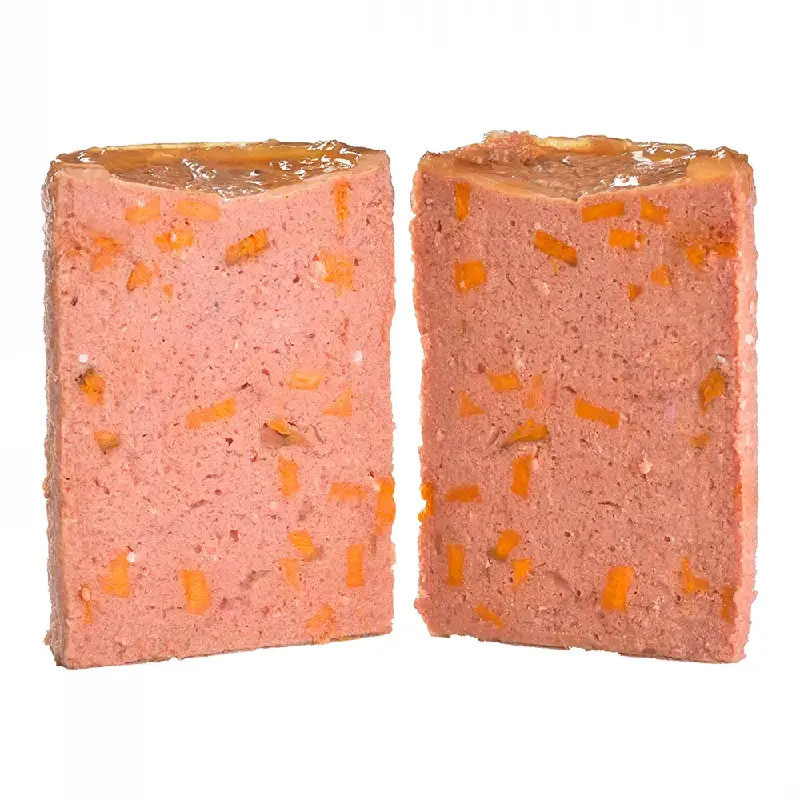 74% de peru (carne e miúdos de peru), 20% de caldo de peru, 5% de batata-doce, 1% de minerais.