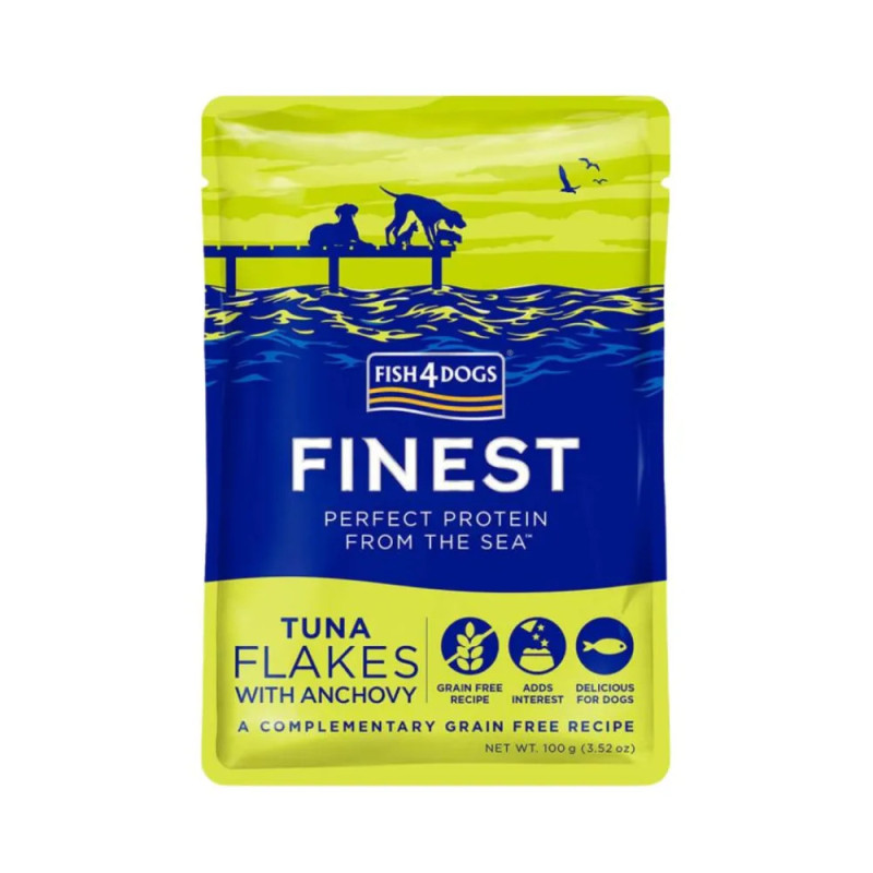Fish4Dogs Finest Pedaços de Atúm com Anchovas é um alimento húmido feito com atúm e anchovas. Esta receita leve é uma refeição completa para o seu cão ou pode ser dada como complemento da ração seca. Com verdadeiros pedaços de atúm e anchovas, este alimento é muito palatável.