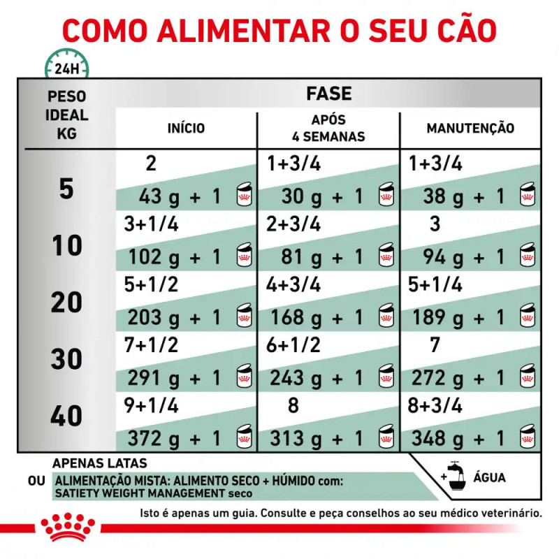 Como parte da gama ROYAL CANIN® Veterinary Health Nutrition, é importante que este produto seja dado ao seu animal de estimação apenas quando recomendado por um médico veterinário. A transição de uma dieta para outra para o seu animal de estimação deve ser feita progressivamente, ao longo de um período de 7–10 dias. Siga sempre a quantidade correta da dose recomendada, sobretudo se misturar alimentos secos e húmidos.