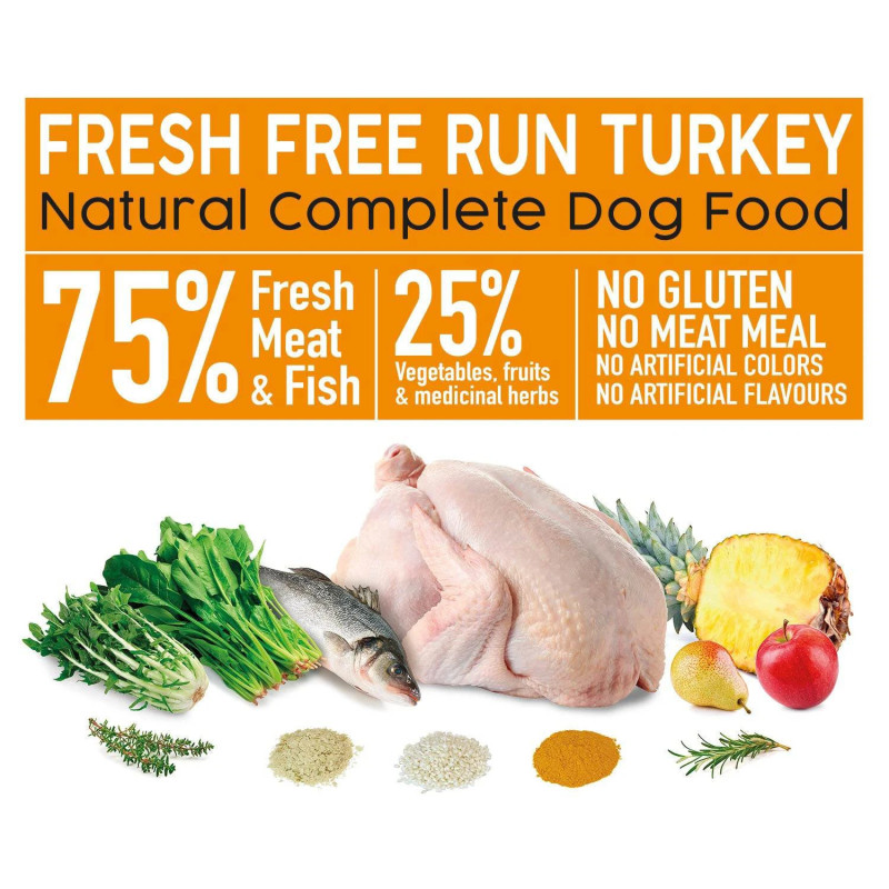55% peru fresco, 20% peixe fresco, arroz, polpa de beterraba picada, espinafres, levedura de cerveja, chicória, ananás, pêra, maçã, curcuma, alecrim, tomilho.