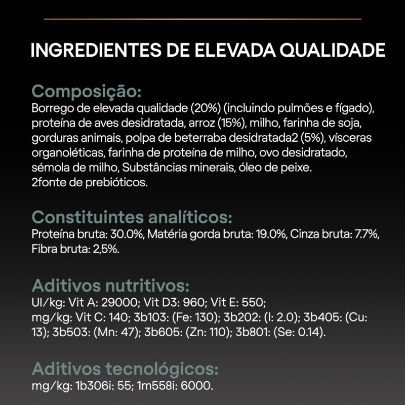 - Borrego como 1º ingrediente e elevado teor de proteína: fornece energia de alta qualidade para cães ativos e ajuda no desenvolvimento saudável dos músculos.