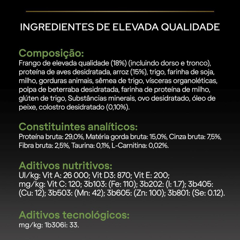Frango (18%), trigo, proteína de aves desidratada, milho, farinha de soja, arroz (7%), gordura animal, fibra de trigo, vísceras organoléticas, polpa de beterraba desidratada, farinha de glúten de milho, farinha de glúten de trigo, minerais, ovo desidratado, óleo de peixe, colostro desidratado (0,1%).