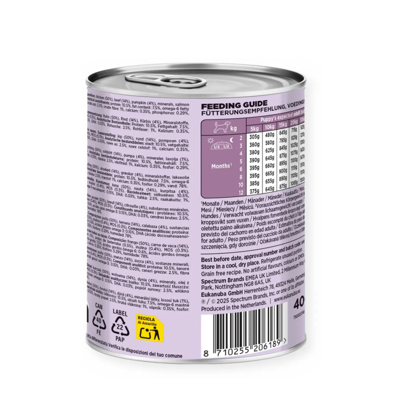 Eukanuba Wet Puppy Vaca e abóbora é um alimento húmido completo e equilibrado, especialmente desenvolvido para cachorros em fase de crescimento, oferecendo uma combinação ideal de sabor, textura e nutrição de elevada qualidade para apoiar um desenvolvimento saudável.