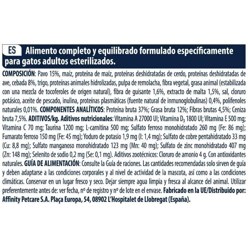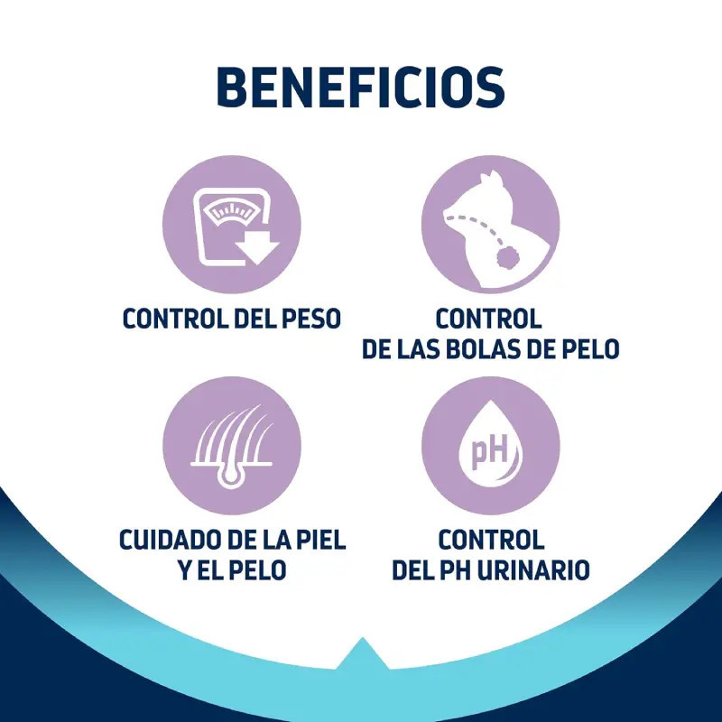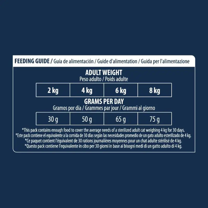 • Ajuda a prevenir a obesidade em gatos esterilizados: graças a um nível reduzido de energia metabolizável, um nível elevado de fibra para favorecer a saciedade e a uma quantidade elevada de proteínas e moderada de matéria gorda para ajudar a manutenção da massa muscular.