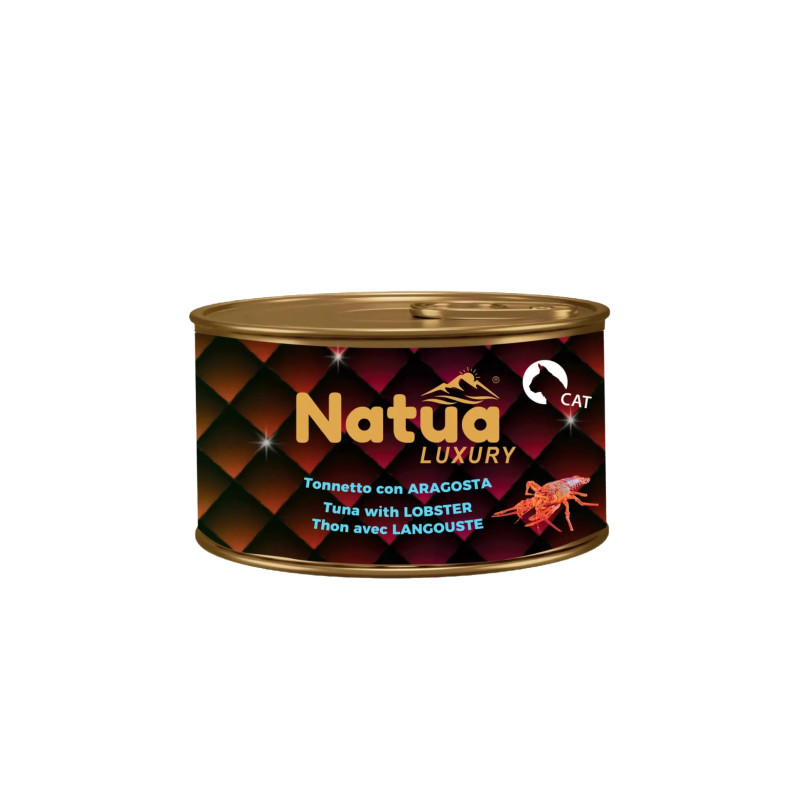 Natua Luxury Cat Atúm com lagosta são latas feitas artesanalmente e 100% naturais. A linha Luxury oferece receitas com ingredientes requintados, muito procurados e 100% naturais, escolhidos para surpreender o seu gato. Uma gama de alta qualidade, preparada à mão e cozinhada a vapor. Sem adição de corantes, conservantes ou aromatizantes, apenas o sabor irresistível dos finos crustáceos, moluscos e carnes selecionadas. Este alimentos são cozidos a vapor em geleia para garantir a suavidade e o máximo sabor.