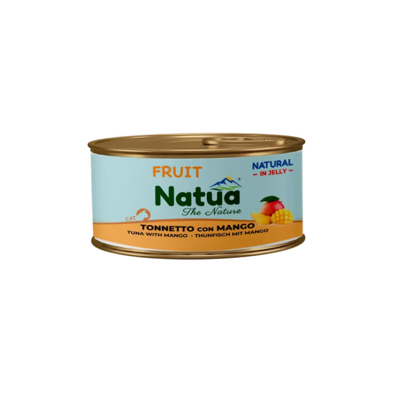 Natua Fruit Cat Atum com manga são latas feitas artesanalmente e 100% naturais. Graças aos ingredientes de alta qualidade de fornecedores selecionados, nasceram estas receitas únicas para o mercado global que oferecem uma vasta escolha de produtos alimentares húmidos complementares cozidos a vapor em geleia para garantir a suavidade e o máximo sabor. Para além do atum fresco junta-se manga que agrega de forma natural ao seu gato as vitaminas e os nutrientes que contribuem para estimular o seu sistema imunológico, retardando o envelhecimento das células e favorecendo a digestão.