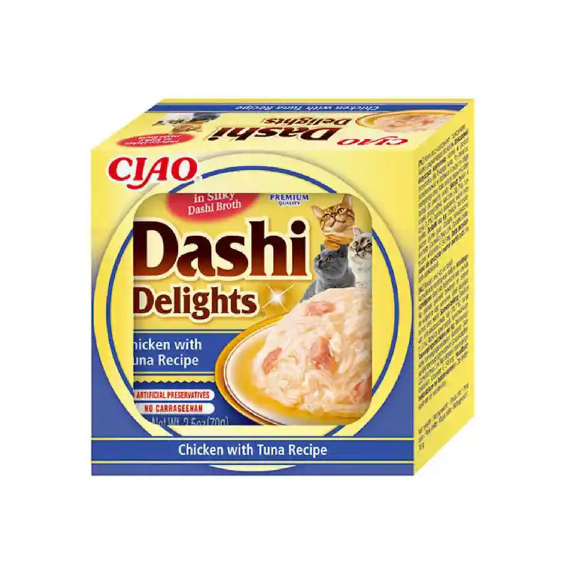 O Dashi Delights Chicken with Tuna Recipe, da Inaba, é um alimento complementar húmido para gatos, que pode ser servido como topper à ração seca ou como petisco ocasional. Não se destina a substituir refeições completas.
