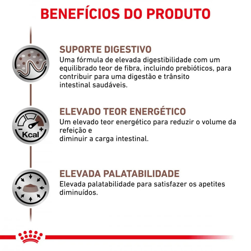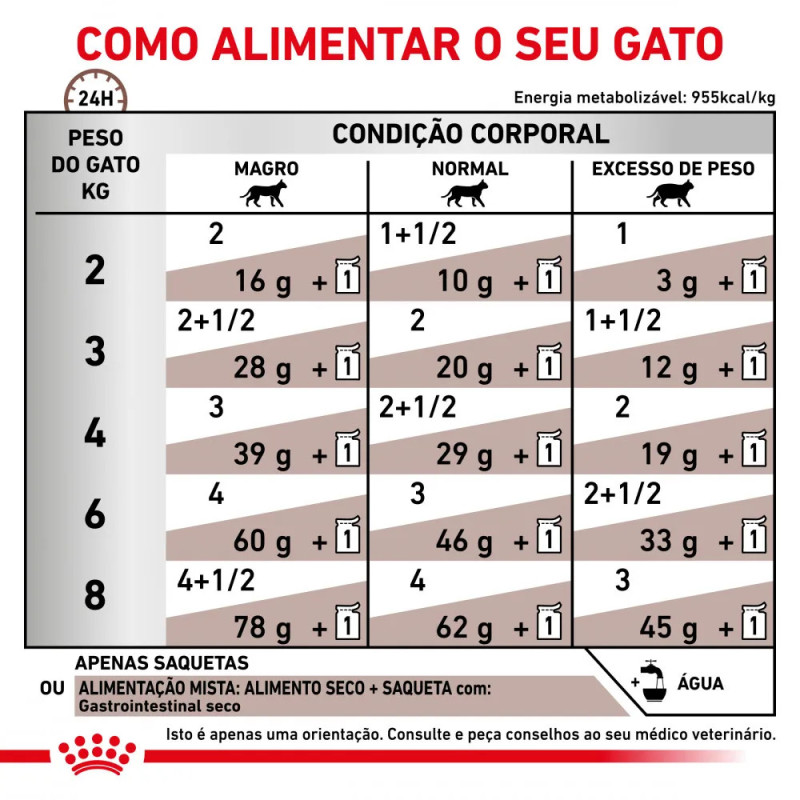 Como parte da gama ROYAL CANIN® Veterinary Health Nutrition é importante que este produto seja dado ao seu animal de estimação apenas quando recomendado por um médico veterinário. A transição de uma dieta para outra para o seu animal de estimação deve ser feita progressivamente ao longo de um período de 7–10 dias. Siga sempre a quantidade correta da dose recomendada, sobretudo se misturar alimentos secos e húmidos.