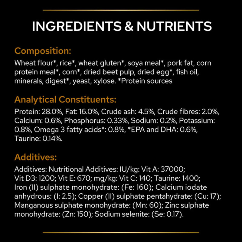 Farinha de trigo*, arroz*, glúten de trigo*, farinha de soja*, gordura de porco, farinha de proteína de milho*, milho*, polpa de beterraba seca, ovo seco*, óleo de peixe, minerais, hidrolisado proteico*, levedura, xilose.