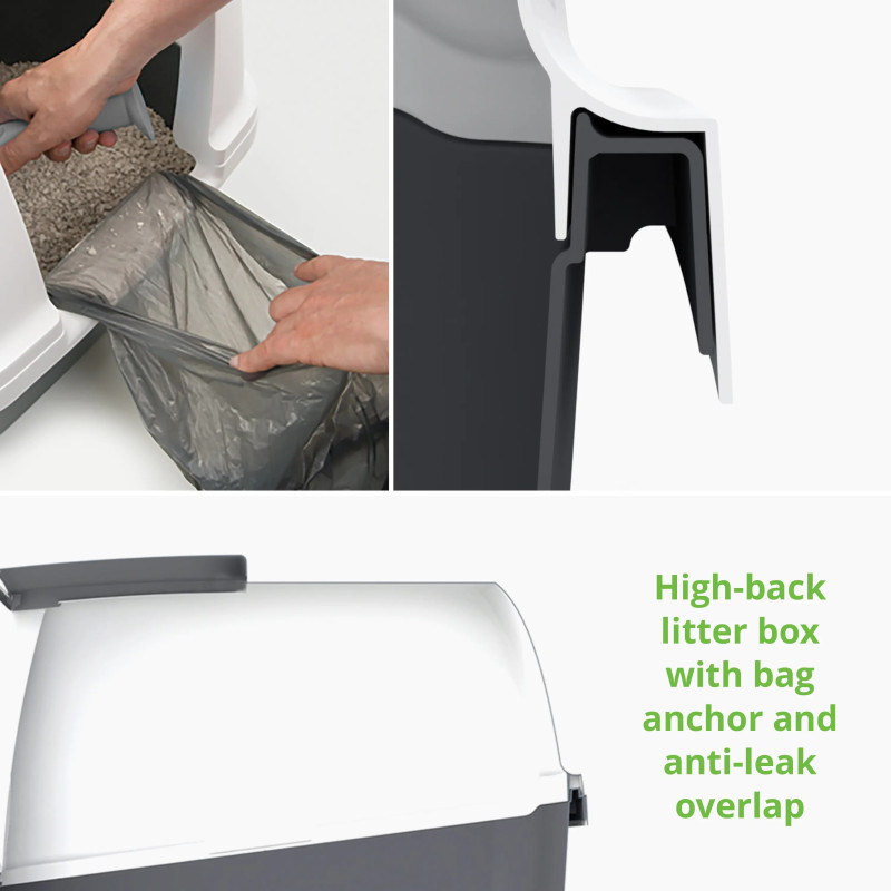 Uma vez que os gatos estão frequentemente virados para a entrada da caixa de areia enquanto se aliviam, as Caixas de Areia Catit são especificamente concebidas com uma parte traseira elevada para ajudar a evitar fugas de urina.