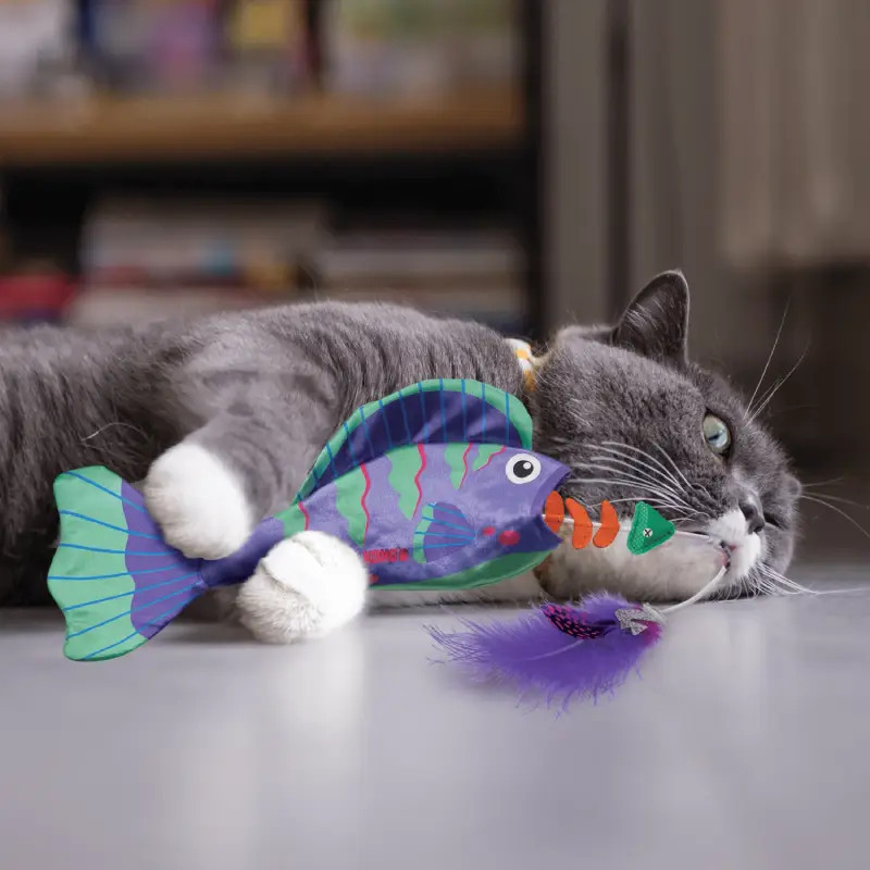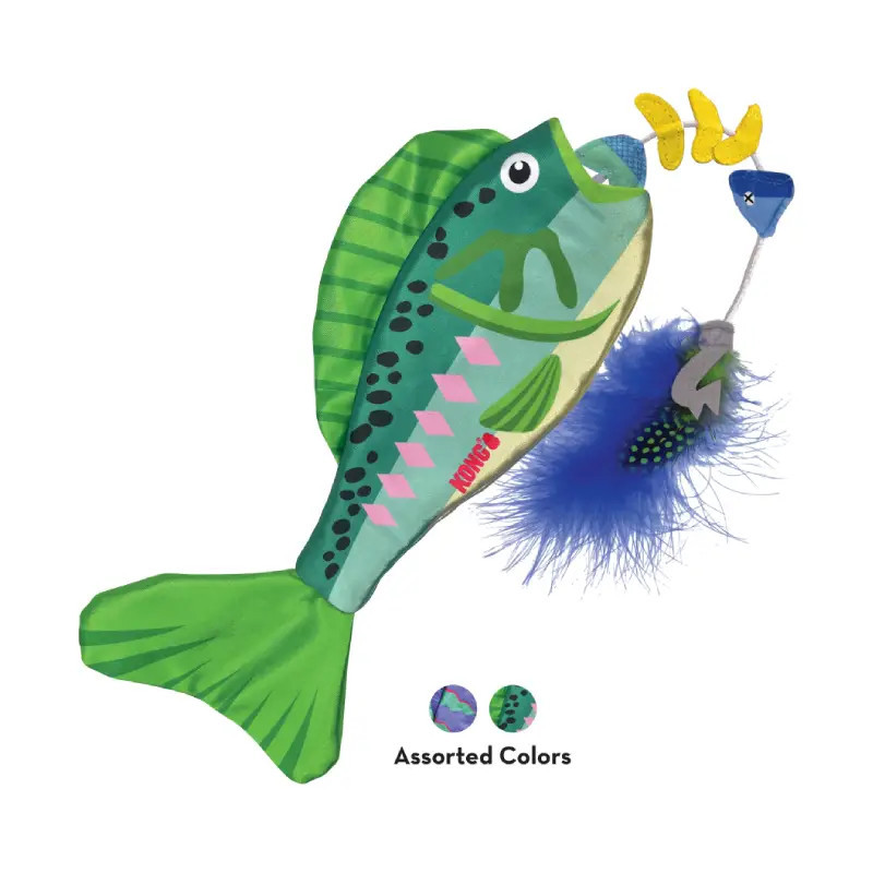 Com KONG North American Premium Catnip e som de plástico no corpo do peixe. Este brinquedo longo, leve e brilhante convida os gatos a brincarem.