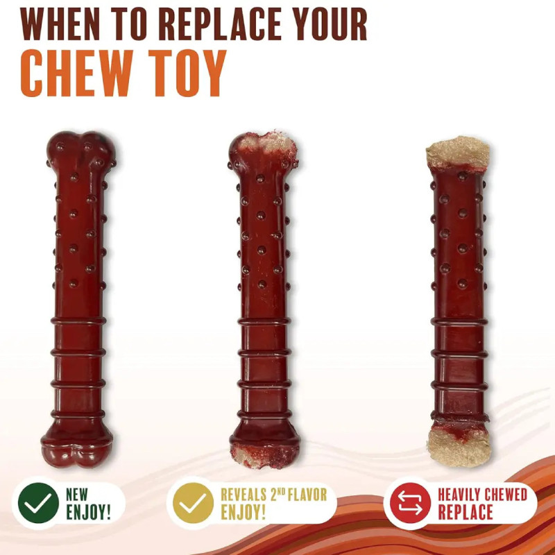 A camada exterior é cuidadosamente basteada com sabor a bacon, utilizando uma técnica exclusiva. À medida que o cão rói, revela-se o interior de cor mais clara com sabor intenso a vaca, mantendo o interesse e incentivando a mastigação saudável por muito mais tempo.