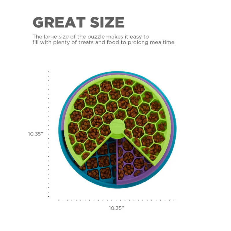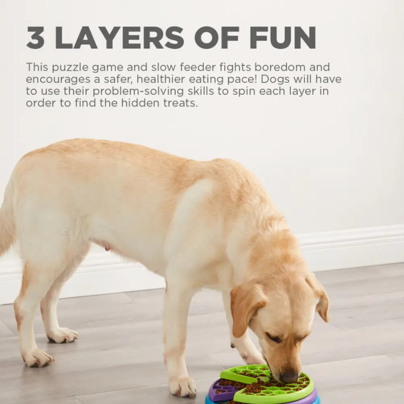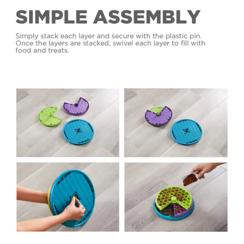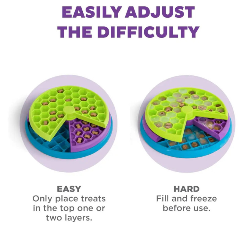 - Três camadas giratórias: O brinquedo possui três discos rotativos com mais de 100 compartimentos para esconder petiscos ou ração. O cão deve girar cada camada para descobrir as recompensas escondidas, promovendo habilidades cognitivas e físicas.