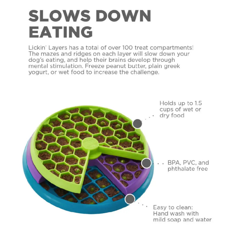 - Alimentador lento integrado: Ideal para cães que comem rapidamente, o Lickin' Layers incentiva uma alimentação mais lenta, melhorando a digestão e prevenindo problemas como inchaço.