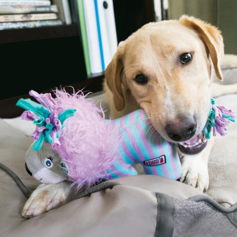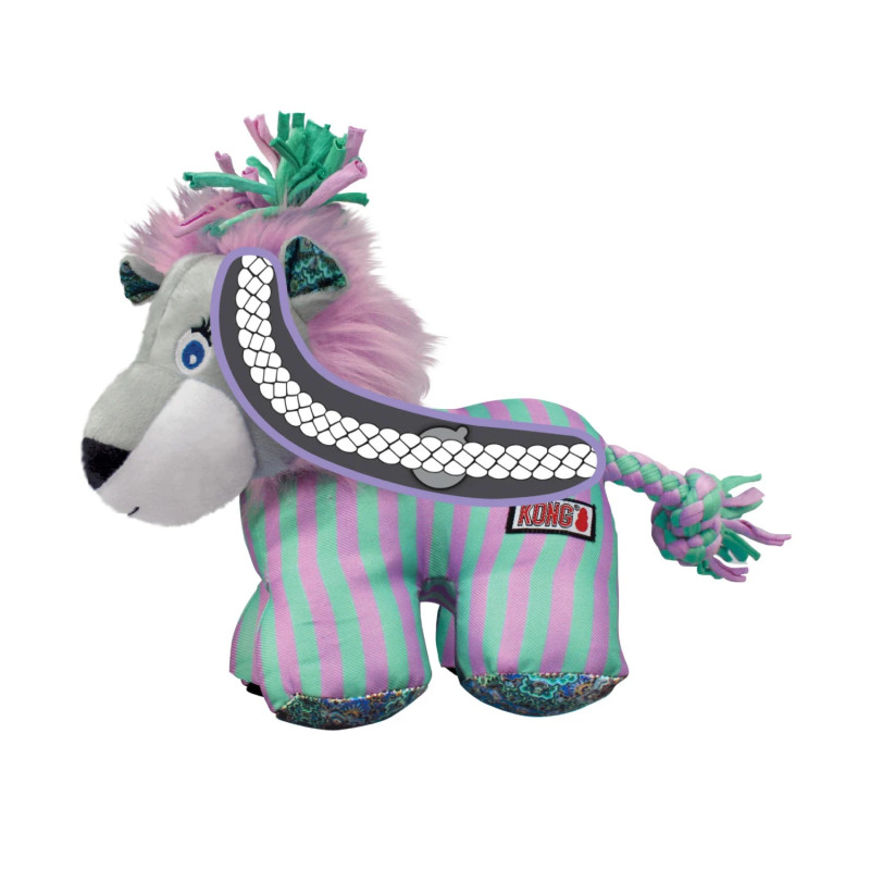 O KONG Knots Carnival possui nós internos e externos resistentes e um exterior de pelúcia. As várias texturas satisfazem os instintos naturais de mastigação, enquanto as cordas externas proporcionam brincadeiras mais interactivas.