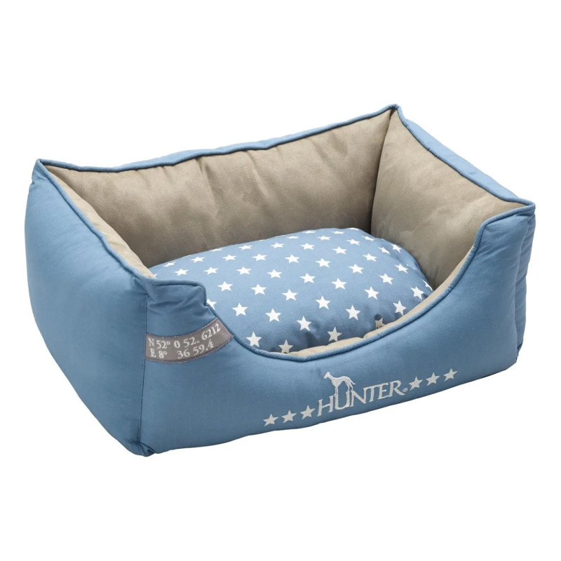 Disponível em duas cores suaves — azul mar e cinzento nuvem —, o sofá Aarhus inspira-se nos tons relaxantes da praia e do oceano. O seu design é enriquecido com um elegante padrão de coordenadas, enquanto a almofada interior reversível apresenta um delicado estampado de estrelas, que também se encontra no detalhe do logótipo HUNTER na parte frontal.