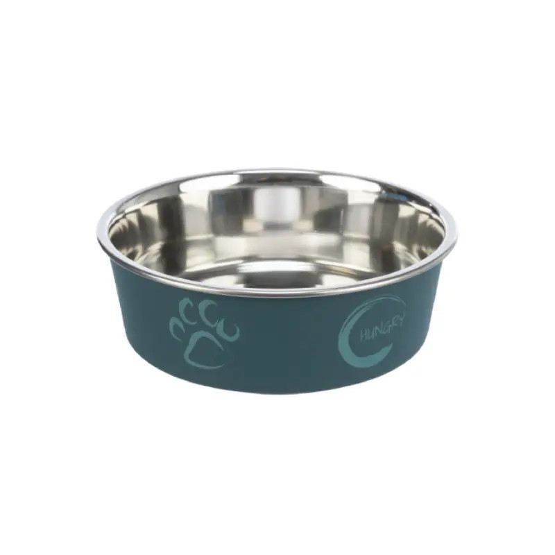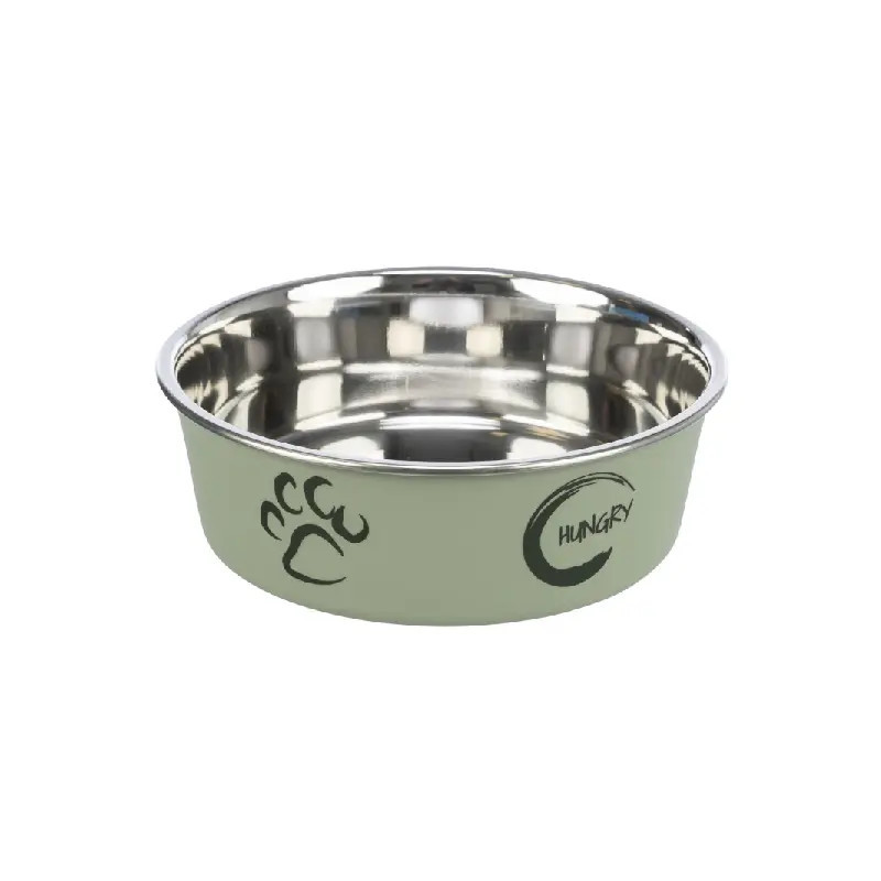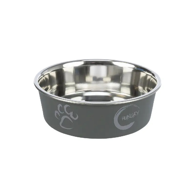 Esta tigela de inox possui um padrão de ossos e patinhas num fundo vermelho tinto. Atenção que o tamanho menor (450 ml) possui apenas patinhas desenhadas.