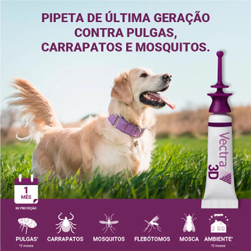 Com uma única aplicação mensal, Vectra 3D protege o seu cão contra pulgas, carraças, mosquitos, flebótomos (transmissores da Leishmaniose) e até moscas. A sua fórmula inovadora não só elimina os parasitas existentes, como também os repele antes mesmo de picarem, prevenindo doenças graves e oferecendo um escudo de proteção duradouro.