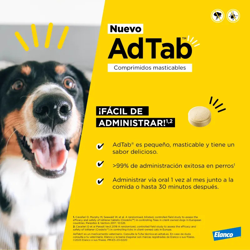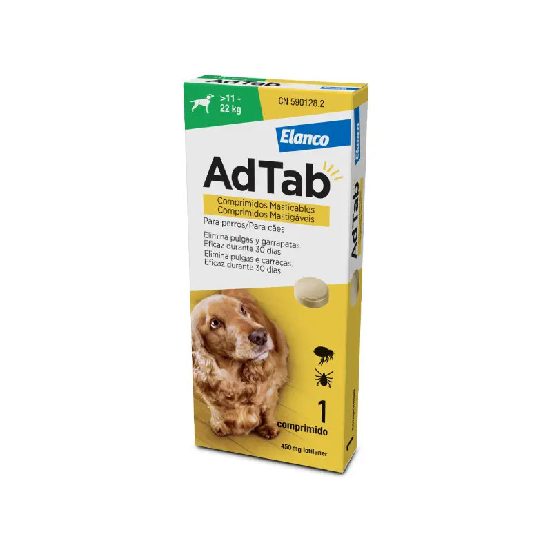 AdTab é indicado para o tratamento de infestações por pulgas e carraças em cães. A eficácia do produto depende do contato dos parasitas com o animal e da sua alimentação. Para garantir a proteção contínua, recomenda-se a administração mensal.