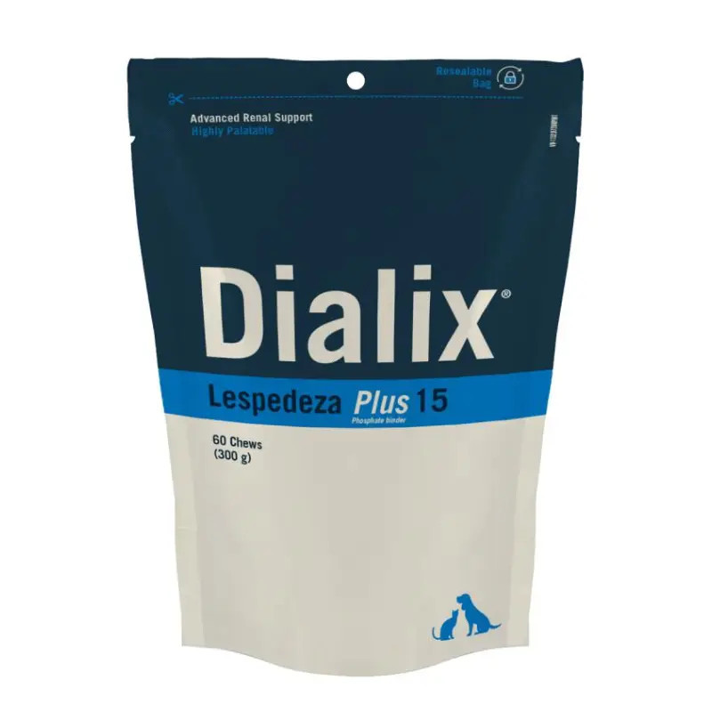 O Dialix Lespedeza-Plus-15 é um suplemento alimentar para cães de porte médio e grande, formulado em chews de alta palatabilidade, rico em flavonóides, que auxiliam na manutenção da função renal, e carbonato de cálcio, que atua como quelante de fosfato.