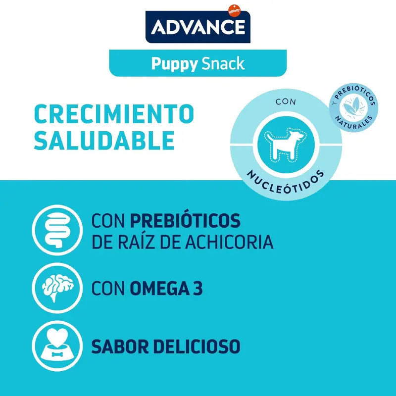 Indicado para cachorros de todas as raças, Advance Puppy Snacks é uma excelente opção de snack funcional, ideal para ser utilizado como recompensa durante o treino ou como complemento nutricional ao longo do dia.
