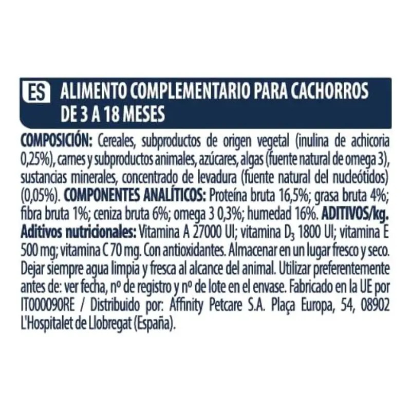 Cereais, subprodutos de origem vegetal (0,25% de inulina de chicória), carnes e subprodutos animais, açúcares, algas (fonte natural de ómega 3),substâncias minerais, concentrado de levedura (0.05% de nucleótidos).