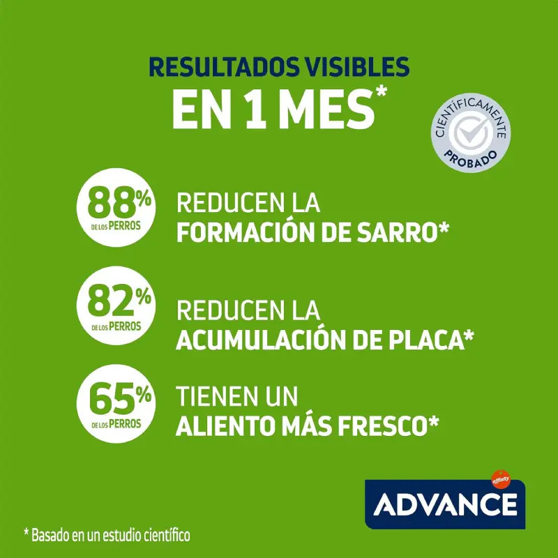 A fórmula exclusiva do ADVANCE Dental Care, com tripla ação para o cuidado dentário do seu cão mini, tem resultados clinicamente comprovados: em apenas 1 mês*, 94% dos cães reduziu a formação de tártaro, 82% dos cães reduziu a acumulação de placa bacteriana e 65% dos cães têm um hálito mais fresco. O stick, adaptado ao cão mini, apresenta um formato especial que ajuda a eliminar os restos de comida dos dentes do seu cão. *Estudo científico. Hálito mais fresco: menor quantidade de compostos voláteis de sulfureto quando comparado com os mesmos cães que não comeram Advance Dog Dental Care Stick.
