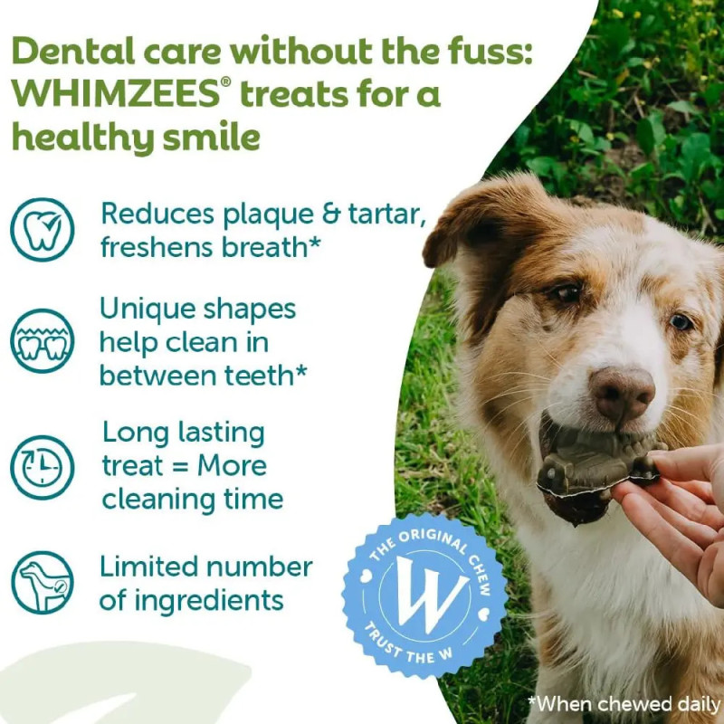 WHIMZEES é uma marca holandesa de petiscos dentais naturais para cães, fabricada em Veendam, uma pequena cidade em Groningen, Holanda. Com ingredientes à base de plantas e sem aditivos artificiais, os produtos são projetados para promover uma higiene bucal diária eficaz. Os seus formatos divertidos e texturas especiais ajudam a reduzir a placa bacteriana e o tártaro, além de manter o hálito fresco. São hipoalergênicos, fáceis de digerir e recomendados por veterinários. Esses produtos possuem o selo VOHC. WHIMZEES combina ciência, saúde e entretenimento para cuidar naturalmente do sorriso do seu cão. Resumindo, 1 palito por dia limpa duas vezes mais e dura três vezes mais.