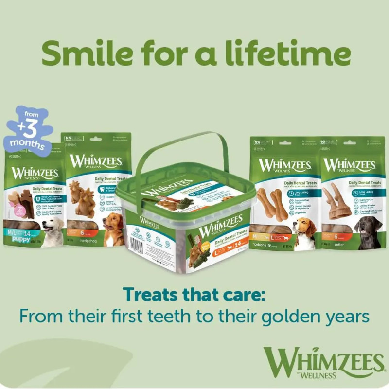 Graças à sua composição única, os WHIMZEES® são feitos com apenas 6 ingredientes naturais que juntos ajudam na saúde dentária do seu cão. Os dentes dos cães precisam de ser cuidados todos os dias para garantir uma boa higiene oral.