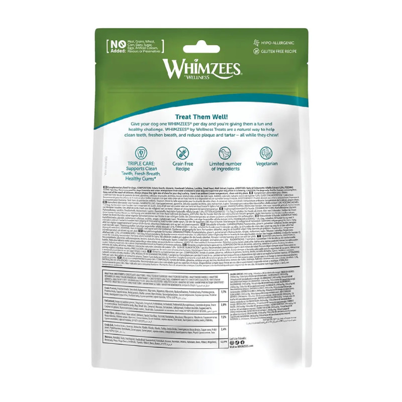 Vegetariano - WHIMZEES® é isento de proteínas, com baixo teor de gordura e cereais (exceto ossos de arroz) e não contém organismos geneticamente modificados. Isto torna o produto fácil de digerir e não interfere com a dieta normal do cão. WHIMZEES® promove uma condição corporal ideal e minimiza a possibilidade de surpresas desagradáveis devido a intolerâncias alimentares.