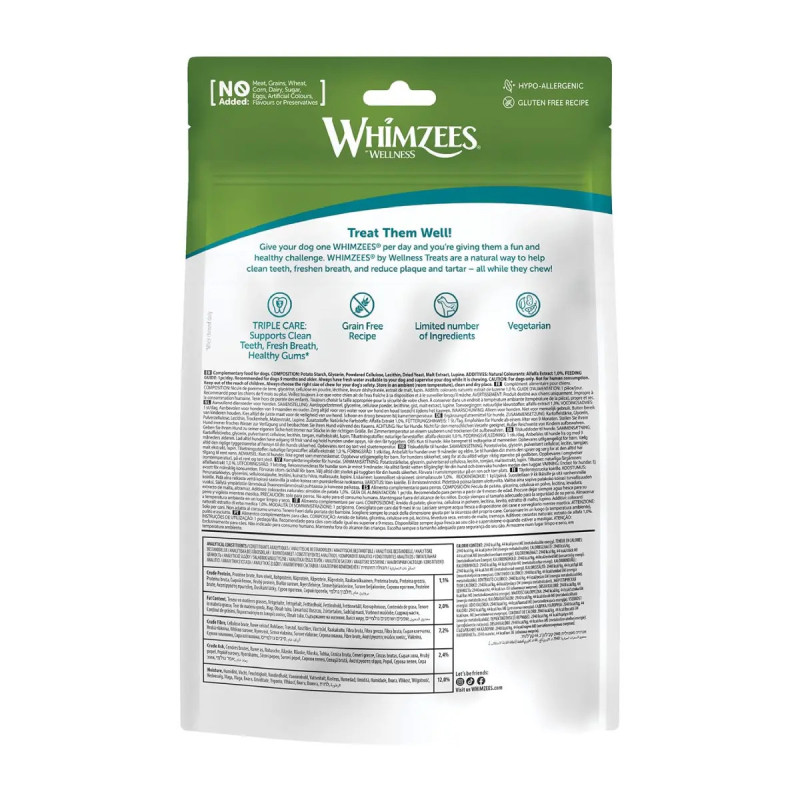 Vegetariano - WHIMZEES® é isento de proteínas, com baixo teor de gordura e cereais (exceto ossos de arroz) e não contém organismos geneticamente modificados. Isto torna o produto fácil de digerir e não interfere com a dieta normal do cão. WHIMZEES® promove uma condição corporal ideal e minimiza a possibilidade de surpresas desagradáveis devido a intolerâncias alimentares.