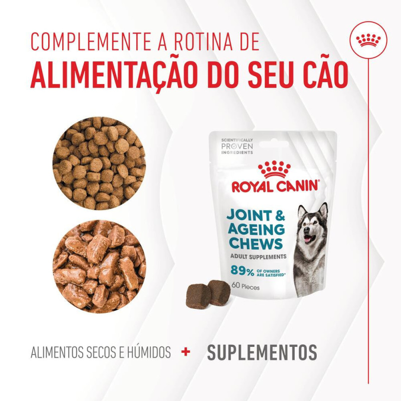 Destinados aos cães adultos, os ROYAL CANIN® JOINT & AGEING CHEWS ADULT SUPPLEMENTS são formulados por médicos veterinários e aprovados pelos cães. Estes suplementos incluem uma combinação de ingredientes cientificamente comprovados, com base em mais de 50 anos de investigação e observação em nutrição canina.