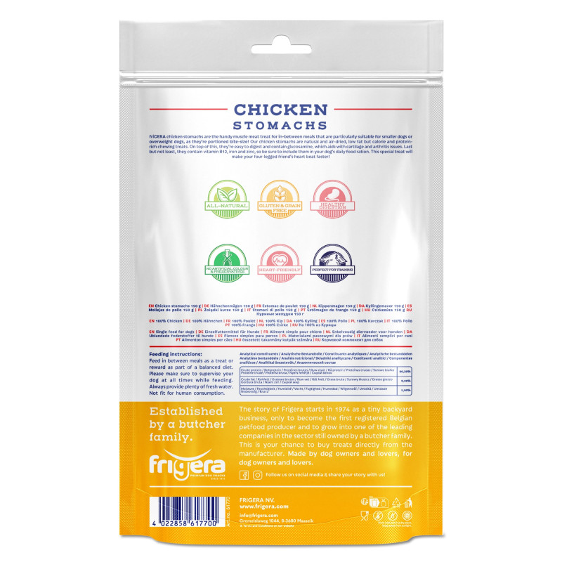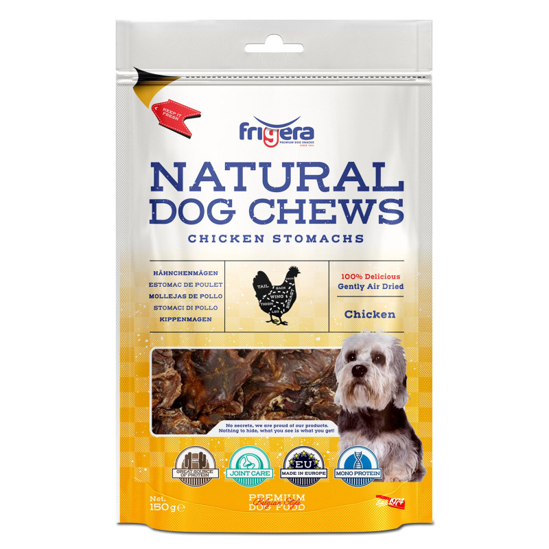 Os Frigera Estômagos de Galinha são o snack perfeito para pequenas recompensas entre refeições, ideais para cães de porte pequeno ou para cães com tendência a ganhar peso, graças às suas porções em tamanho reduzido.