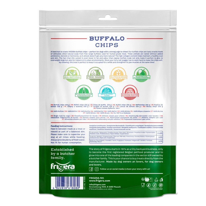 Provenientes de búfalos criados ao ar livre e destinados ao consumo humano, estes chips são totalmente naturais e livres de antibióticos, esteroides ou hormonas adicionadas. O elevado teor de proteína contribui para a energia e vitalidade do seu cão, enquanto o colagénio ajuda a manter uma pele saudável e um pelo brilhante.