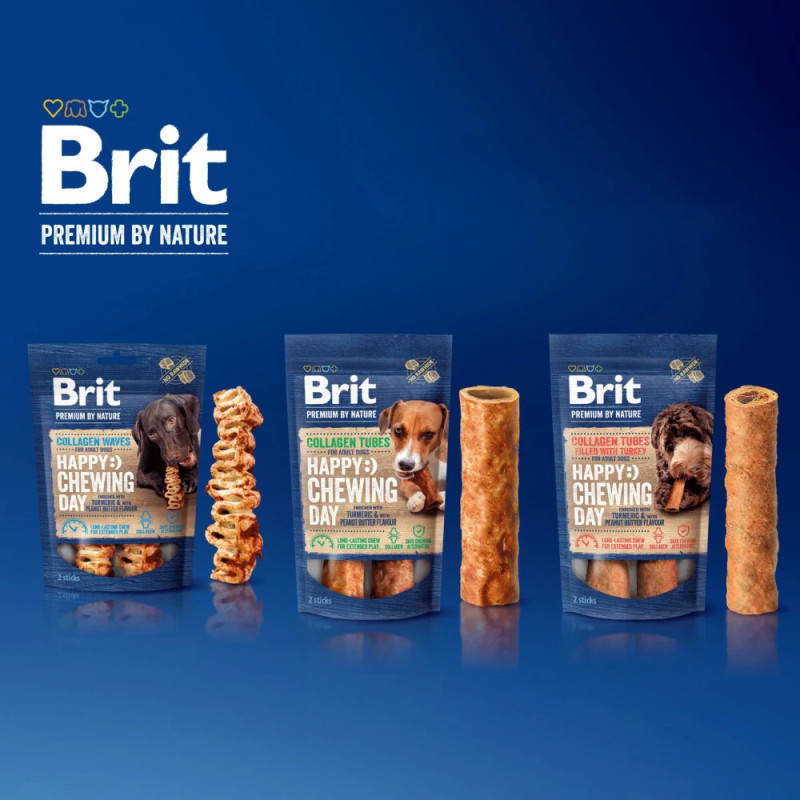 Brit Premium by Nature Dog Collagen Chews Tubes são snacks de colagénio em forma de tubos enriquecidos com cúrcuma e sabor de manteiga de amendoim proporcionam prazer na mastigação diária e auxiliam na saúde das articulações e dos dentes.