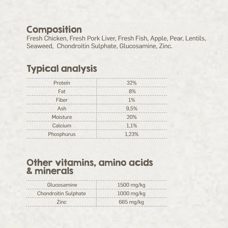 Frango fresco, fígado fresco de porco, peixe fresco, maçã, pera, lentilhas, algas marinhas, sulfato de condroitina, glucosamina, zinco.
