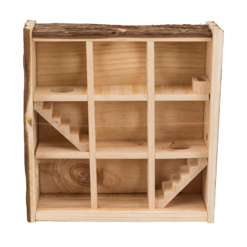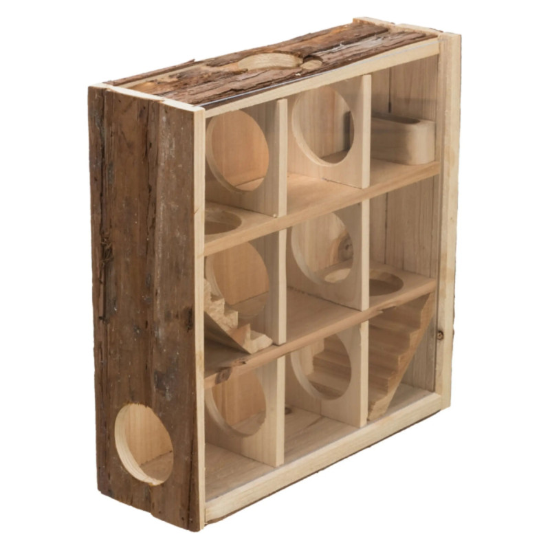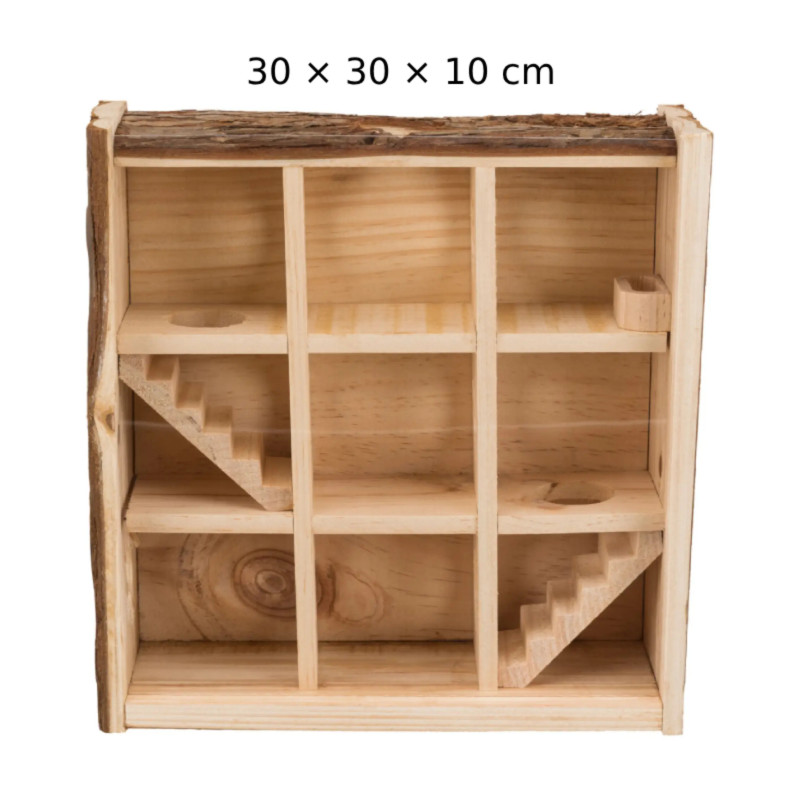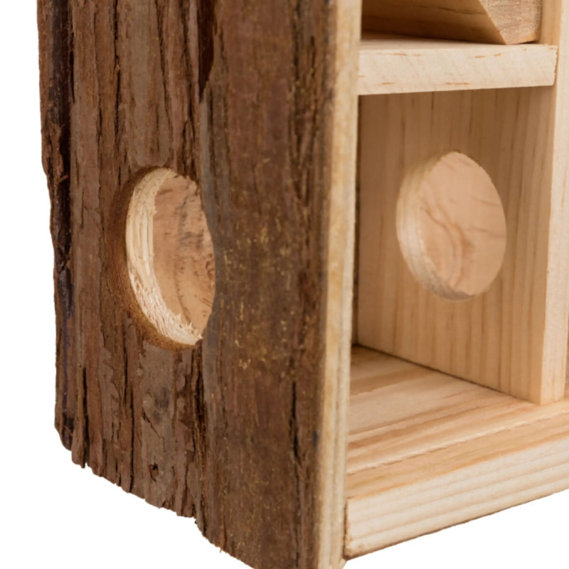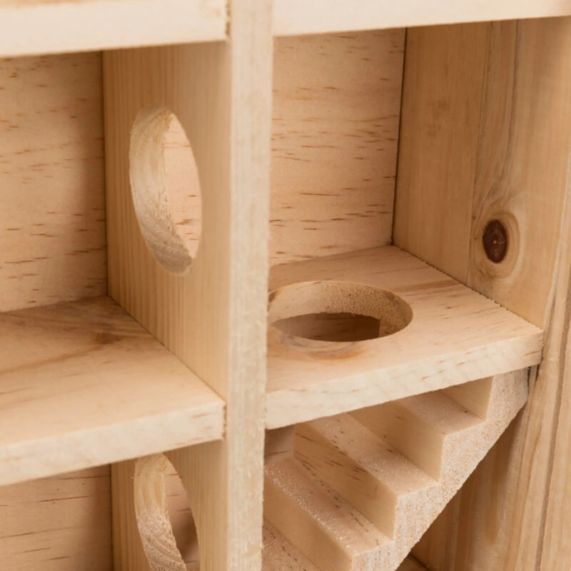 Projetada para hamsters anões, a entrada de 4 cm é um pouco maior do que um rato precisaria. Feita com madeiras macias e colas à base de celulose, a Trixie Play Tower é segura, durável e ecológica.