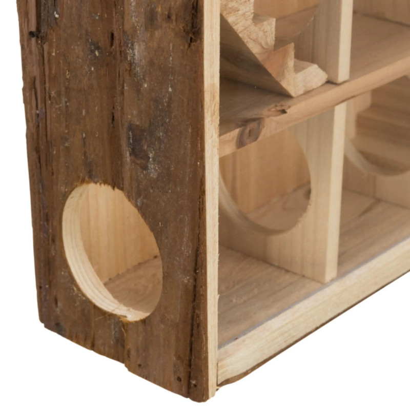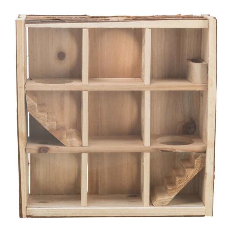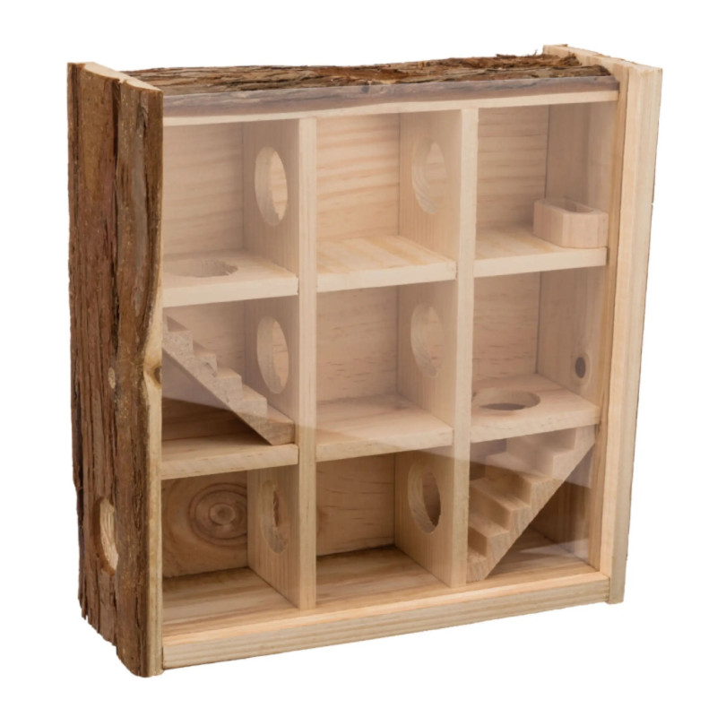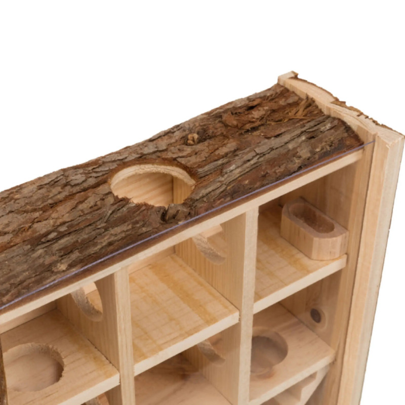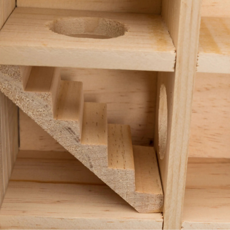 Projetada para hamsters anões, a entrada de 4 cm é um pouco maior do que um rato precisaria. Feita com madeiras macias e colas à base de celulose, a Trixie Play Tower é segura, durável e ecológica.