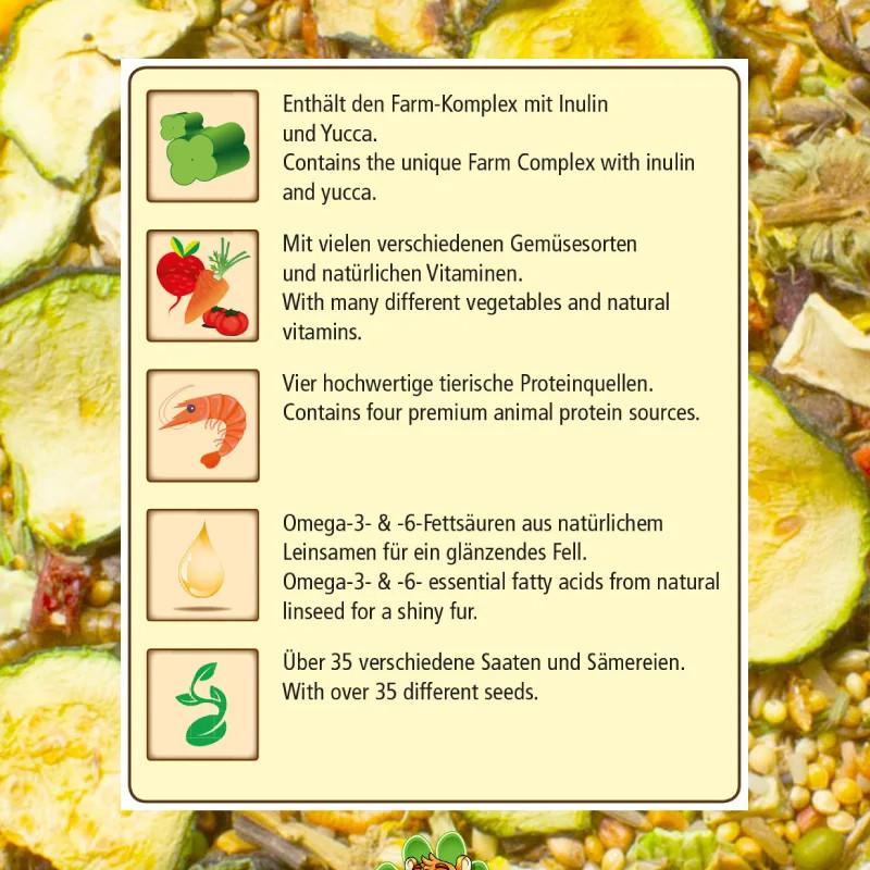 Com ingredientes naturais de alta qualidade — como cereais, vegetais, ervas e insetos desidratados — esta receita garante uma dieta rica e variada.