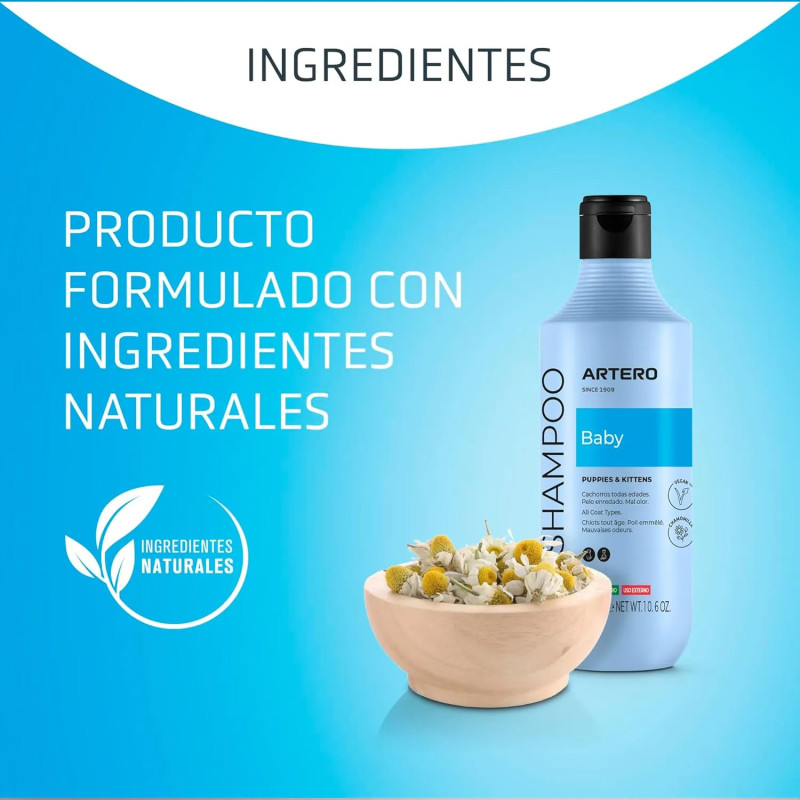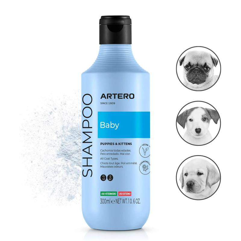 O Artero champô Baby é adequado para todo tipo de raças e, especialmente, para os cachorros com a pele sensível. A sua fórmula, feita à base de tensioativos vegetais, é muito suave de forma a não irritar nem secar a pele sensível dos cachorros. Os ingredientes de Artero Baby permitem uma limpeza delicada e suave para as peles mais sensíveis. Além de cuidar da pele dos cachorros, acalma as possíveis irritações e proporciona um efeito sedoso ao pelo e facilita a posterior escovação. As vitaminas do shampoo também nutrem a pelagem e assim fazem com que pareça mais brilhante e cheia de vitalidade.