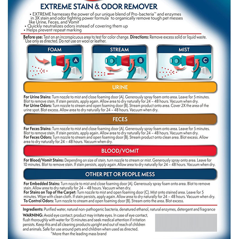 Adequado para retirar e eliminar o cheiro de vómitos, urina e fezes. Pode ser utilizado em tapetes, estofos, camas de animais, roupas ou qualquer superfície lavável com água. Não utilizar em peles e lãs.