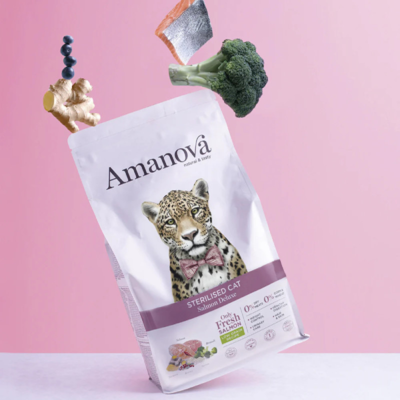 Esta fórmula foi desenvolvida por veterinários contém L-Carnitina que ajudará a metabolizar as gorduras e fornecerá proteínas de alta qualidade que fortalecerão os músculos. Inclui camomila, que ajudará a aliviar o stresse e fortalecer o sistema digestivo, o cálcio e o fósforo manterão os dentes fortes e saudáveis. Amanova Sterilized Salmon Deluxe é uma receita exclusiva de alimentação natural para gatos esterilizados, sem farinhas de carne ou carnes desidratadas, contém minerais, fibras alimentares e ingredientes especiais como psyllium, probióticos, quinoa e óleo de peixe que ajudarão a melhorar a função renal, a digestão e evitar a formação de bolas de pelo.