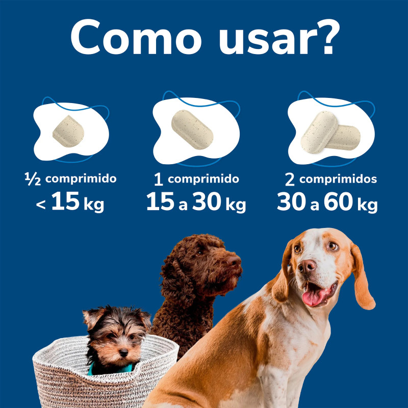 Caixa com 120 comprimidos palatáveis, divisíveis em duas partes iguais para facilitar a dosagem.